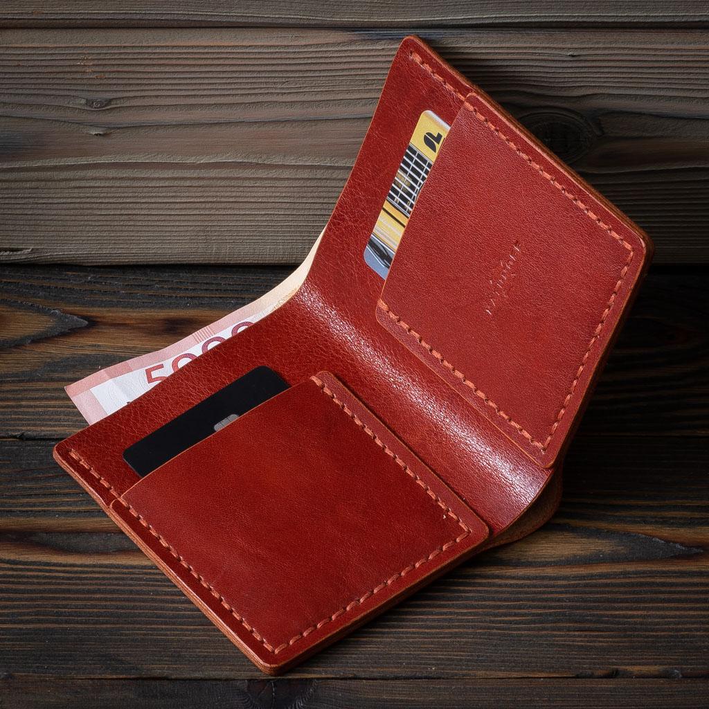 Лаконичное унисекс портмоне для ношения в кармане джинс или сумки, вмещает до 30 купюр и 2 — 6 карточек (1-3 шт. в каждый карман). Сделано из плотной кожи толщиной 1,5 мм.